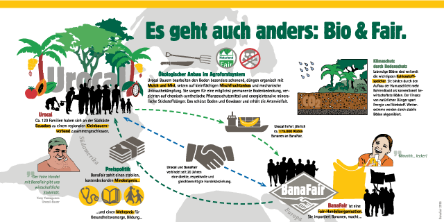 Die Alternative zum konventionellen Bananenanbau, der nur mit viel Gift funktioniert, ist der ökologische Landbau. Bessere Preise und Arbeitsbedingungen für Kleinbauern garantiert der Faire Handel. Eine neue Infografik stellt beide Themen am Beispiel des Kleinbauernverbandes Urocal und BanaFair vor.